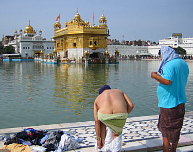 ……。 な? バカバカしいだろう? パキスタンとインドの国境にいるタクシーの運転手が、3年16組の木元くんの体操服だぞ?? どう見てもインド人なのにも関わらず木元くんだぞ? ね、これがインドなんだよ(泣)。 16組というクラスがあるかどうかわからないので、もしかしたら31年6組かもしれない。もしくは青い色で学年を表していて、3組16番なのかもしれない。キモトくんではなく、モクゲンさんかもしれない。ただ、なんにせよこの体操着は、木元さん一家が善意をもって発展途上国に優しく寄付したものなのだろう。それをインド人が大切に着てくれているというそのことはとても微笑ましいことであるが、インドに入国して10分後、一番最初に乗ったタクシーの運転手が、その木元くんの体操服を着ているというこの絶好のタイミングがまさにインドなのだ。他の国だったらこのタイミングはあり得ない。インドでしかあり得ない(号泣)。 ということで、木元くんの運転で約30分ほど、中心地のゴールデンテンプルへ着いた。 さあ、気分を切り替えよう。 アムリトサルはそんなに大きな町ではないが、この黄金寺院、ゴールデンテンプルという寺がシーク教の総本山になっており、巡礼者がインド各地から集まっている。インドといえばターバンを連想するものであるが、あのターバンはシーク教徒が髪の毛を隠すために巻いているものなのだ。そういえばタイガージェットシンもターバンを巻いていたから、疑う余地も無く彼もシーク教徒なのだろう。……しかし、シーク教ではサーベルで対戦相手を襲って流血させたり、伊勢丹の入り口で待ち伏せしてアントニオ猪木・倍賞美津子夫妻を襲撃したりすることが許されているのだろうか?? そう考えるとなんか物騒な宗教という気がするなあ。 しかしこの黄金寺院の良いところは、巡礼者と同じく旅行者も宿泊できる施設があるというところ。しかも黄金旅行者だけでなく、普通の旅行者でも受け入れてくれるのだ。当然いくらか寄付をするのだが、面倒くさくなくてよいためオレもここに泊まることにした。 ところで、この寺の敷地内では男女共に頭髪を見せることが禁じられているらしい。よく見ると、たしかに外国人旅行者も全員オレンジ色のスカーフのようなもので頭を隠している。オレもこの世界が羨むアジアンビューティーな頭髪をなんとかしなければならないのだが、どこでスカーフが貰えるんだろう? とりあえず白人旅行者に聞いてみることにした。 「エクスキューズミー(私を許して)! その頭に巻いているスカーフはどこにあるんですか?」 「ああ、入り口出た路上に売店が並んでいるだろう。あそこで売ってたんだよ。10ルピーだよ」 「たったの10ルピーですね。サンキュー!」 「ユーアーウェルカム!」 ということで、早速オレは敷地の外にある屋台型の売店へ向かった。すると案の定、14,5歳と思われるかわいい少女が1人で店番をしている店に、白人がつけていたのと全く同じスカーフが大量に並んでいた。 「ナマステおじょうちゃん。そのスカーフをひとつ、この素敵なお兄さんにちょうだいね」 「ハーイ! 1枚15ルピーよ!」 「あっはっはー! 残念だけど、おにいさん値段知ってるんだよね。さっき聞いた人は10ルピーで買ったって言ってたよ?」 「あら、そうなんだ」 「もう1回聞くけど、このスカーフいくら? このオレンジ色の、全く同じ物を他の人が10ルピーで買ったって言ってた、この定価10ルピーのスカーフはおいくらかなあ?」 「1枚15ルピーよ!」 「てめえ大人しくしてりゃ調子に乗りやがってこのガキがっっっ!!! いつまでもオレがジャニーズ系の人のいいお兄さんだと思うなよオイっっ!!」 「キャーー!!」 「その可愛い顔にちょっと萌えたからまあここはお兄さん堪えてやるよ。だがもうおまえのところでは買わん!!! 他の店に行くからなっ!!! あばよっっっ!!!」 「ま、待って! オーケー! 10ルピーよ! 本当は1枚10ルピーだから買ってよ!」 「このガキャ〜〜〜。……ね、おじょうちゃん、最初から素直に10ルピーって言ってれば今までのイライラするプロセスは必要ないでしょ? お互いに時間も体力も無駄にならないでしょ? なんで国境を越えた途端こうかなあ……。まあいいや。今後気をつけるように。はい、50ルピー」 「ありがとう! じゃあ5枚ね!」 「50ルピー札で支払って釣りをよこせって意味だろうがっっ!!! 会話の流れからわかるだろ!! なんでわざわざ不自然な展開をチョイスしようとするんだよっ!!!」 「はーい。じゃあお釣り持ってくるから、1枚好きなのを取っていいわよ」 「好きなのって、大量生産品じゃねーか……」 ということでオレは早速スカーフを頭に巻いてみた。三角巾を着けるのなんて、小学校の掃除当番以来であろう。やはりここは、先生がいなくなったら三角巾を取り外して、両端を持ってクルクルと細くして友達の腿めがけてピシッ!! とやって騒がねば。 掃除当番に変身して清潔に待っていると、少女が釣りを持って戻って来