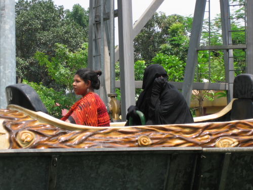 ![]() 〜バングラデシュの首都ダッカ〜 記念すべきバングラデシュでの初夜を終え、もはや生娘で無くなったオレは昨日までの可憐な恥じらいはどこへやら、上半身裸のふんどし姿で宿をチェックアウトし、秋葉原の露出アイドルのようにわざと股を開いて食い込み部分を観衆に見せながら、バングラの首都ダッカまでのバスに乗った。 田園風景の中を2時間ほど走ったのだが、途中で窓の外の沼地をぼんやり見ていたら、黒い水面がボコボコっとなったと思ったら沼の中からヌマ〜ッガバ〜ッ!と人間が登場してきて、オレは半魚人が出て来たと思ってバスの中で恐怖の叫び声をあげた。もし今バングラデシュを旅行中の仮面ライダーが近くを通りかかっていたら、怪人だと思って容赦なくライダーキックで飛びかかって行ったことだろう。 そして5時間後にダッカに着いた(あっさり)。 バングラデシュの首都ダッカはこれがまた、インドに輪をかけて混沌としていた。 大通りに出ると、オートリクシャやサイクルリクシャー、自転車やバイクやタクシーやバスやチョロQやバングラデシュ人やオレや犬先輩でアスファルトが埋め尽くされ、排気ガスが雷を呼んでいる。本当に排気ガスは酷く、オレはダッカ滞在2日目くらいから咳が止まらなくなり、毎夜咳き込んでほとんど寝ることができなかった。 実際毎日のように夕方から夜にかけて激しい雷雨が町を襲い、街灯もネオンもほとんどないダッカの暗闇の中では、稲光が夜空を駆け巡る姿がとてもくっきりと見える。それはもう人間がどうあがいても抵抗できない巨大な闇の世界のパワーをありありと感じ、あまりの恐ろしさに背筋は凍り、腎臓は震えて活動を活発にしオシッコがたくさん出たのだ。 さて、バングラデシュは人々が親切なだけでなく、日本語を喋るおじさんが多いというのも特徴的である。これはイランと似ている。何しろ国境を越えてからここまで、全ての町で日本語が通じる地元民と出会ったほどだ。もちろん彼らが日本に出稼ぎに出ていたからで、たとえばジュソールで会ったお方は、茨木のプレス工場で働いていたということであった。 オレはバングラデシュの情報がないものだから、町で日本語使いを発見するとここぞとばかりに質問の雨あられ嵐雷雨霙(みぞれ)雹(ひょう)を浴びせた。今日もダッカの裏通りのバザールを歩いていると、ムハンマドという通りがかりのおじさん(職業:通りがかりのおじさん)が「ここはさあ、ダッカのアキハバラなんだよね。今、ほらなに、ウチの換気扇が壊れちゃってさ。それで新しいのを買いに来たのね(正確にこの通り言っていた)」などと濃い顔に似合わぬスムーズな日本語で喋りかけてくるのであった。 他の大抵の日本語使いと同じく、ムハンマドも自分の携帯の番号をメモに書いて渡してくれ、「何か困ったことがあったら電話してね」と、道で出会っただけの旅人に絶大なる協力を申し出てくれるのだ(涙)。 …………。もしオレがいつか地上100メートルの高さの岸壁に観光に行って、ふと見ると崖の縁からバングラデシュ人とインド人がそれぞれぶら下がって「助けてくれ〜」と叫んでいたら、オレはまずなによりも先にバングラデシュ人を引き上げてやり、もしその後に余力が残っていたなら、そこでようやくインド人の方に駆け寄って、そしてインド人を力いっぱい蹴落とすだろう。 これがダッカの秋葉原。謎のミニ傘を頭に装備しているおじさんが、その傘で何を防ごうとしているのかは定かではない。 ![]() ……ということで、オレはその翌日、ムハンマドさんから教えてもらったバングラデシュ最大の遊園地、ファンタジーキングダムにやってきた。はるばるダッカから2時間もかけて。もちろん、1人で。 寂しくない。寂しくないんだ。遊園地というものをわかっていないあんたにオレは言いたい。いいか、遊園地っていうのはな、基本的に1人で行くもんなんだよ。考えてみろよ、彼女と2人でだったら、別に遊園地じゃなくても近所の公園でもアパートの部屋でも何処でも楽しいだろうがっっ!!! だからわざわざ女と遊園地なんかに行く必要は無いのだっっっ!!! ところがどうだ、1人の場合は公園に行ってもデパ地下に行ってもアパートの部屋にこもっていても全然楽しくない!! 普通に生きていても楽しくないんだオレはっっ(号泣)!!!! だから一人でこそ楽しむために遊園地に行くんだよっっ!!! あえりゃ〜〜〜〜〜〜〜っっ(いろいろな気持ちが交錯し感極まった叫び)!!!! しかし何か嫌な予感のする、暗雲立ちこめるファンタジーキングダム(日本語訳:空想王国) ![]() まあそんなわけだがともあれここは、外観を見てわかるとおり、パキスタンラホールのインチキ蛇女や絶叫観覧車があった意味不明なトワイライトゾーンに比べれば、ずっとまともな遊園地だということがわかる。ちょっとした高級感すら漂っているではないか。お菓子でいえばヨックモックくらいの高級感が漂っている。少なくともこれほどの