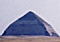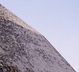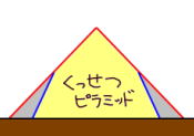 ということでオレは考えた。 こういう時に必要になるのは、逆転の発想である。 今まで出た3つの説に共通しているのは、なぜかみんな「最初は急角度で造り始めて、途中から緩やかに角度を変更した」と思い込んでいるところだ。……まったく、これだから学者は頭が固いと言われるんだ。 違うんだよ。(ここから作者の考案した、学会に波紋を呼ぶ第4の説)このピラミッドは途中から角度を変えたのではなく、最初はごく普通の、一直線の斜面を持つピラミッドだったのである。 下の図を見ていただきたい。