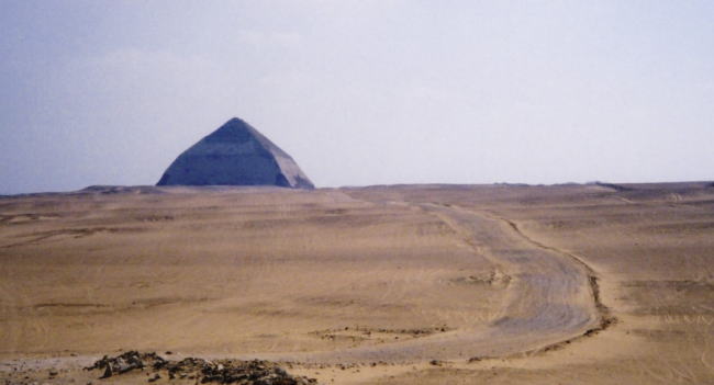 では、なぜ最初の状態のままではなく、角が削れてしまっているのか? もちろん、オレの説はその疑問にもキチンと答えているよ。細かいところまで、当事者しか知らなかった4600年前の事情までしっかり赤裸々に明らかにしている。研究者たるもの、真実を求める時は重箱の蓋の裏まで徹底追及しなければいけないのだ。 この屈折ピラミッドを造ったのはスネフェルという王である。造ったといっても別にスネフェルさんが1人で石を一生懸命運んで組み立てたというわけではないが、この屈折ピラミッドの主であるスネフェル王の息子が、クフ王である。つまり、ここから数十km北のギザにあるクフ王のピラミッドは、このスネフェル王の屈折ピラミッドからほどなくして建設されたのだ。 きっと、今から4550年前、クフ王のピラミッドを建築している途中に、王と建築担当者のヘムオンとの間にこのような会話が行われたに違いない。 ほわんほわんほわん…………(回想シーン:紀元前2550年) 「おお、ヘムオンよ、私のピラミッドの進展具合はいかがかな?」 「げっ、クフ王……」 「なんじゃ、せっかく王としてねぎらいの言葉をかけてやってるのにその渋い顔は。この世界最大のピラミッド建築という喜ばしい偉業を前にして縁起が悪いではないか」 「あ、あの、クフ王さま、なんというかあの、まことに申し上げにくいのですが……」 「え? どうかした?」 「いや、その、まあたいしたことは無いと言い切れないことも無く、ご報告しないならしないでも別にいいかもしれないなんてそんな感じなんですけど」 「なに? なによ? そんな言い方されたら余計気になるじゃん! 言ってよ。とりあえず言ってみなって」 「はい……。実は、スネフェル王のピラミッドなんですが……」 「うむ。父上のピラミッドがどうかいたしたか?」 「あの、我々ギザまで石を運ぶ時に、いつもそのお父様のピラミッドの脇の国道を通るんですけど」 「わかっておる。あの国道出来てから、ダフシュール〜カイロ間が2時間で結ばれるようになったんだよね」 「実は、今回4tトラックの運転を入ったばかりの若いもんにやらせてたんですが、その、ウトウトしてたらしくて、お父さんのピラミッドをトラックでちょっと擦っちゃったんですよ。で角が結構削れちゃって……」 「ちょっと!!! それ本当!!!!」 「すみません、なんか、昨日歓迎会があって朝まで飲んでたらしくて……」 「そんな細かい理由なんてどうでもいいよ!!! どうしてくれんのよ!!?? お父ちゃんに怒られちゃうじゃんよ!!!!!」 「え、でもお父様もうとっくに亡くなってますし、そんなに気にすることないんじゃないかなって」 「何言ってんの!! 生き返るじゃんよ! なんのためにお父ちゃんミイラになってると思ってるの!!! 時が来たら復活するんでしょうが!!!」 「そ、そうでした……。ミイラになってたんでした……」 「当たり前じゃんよそんなの!!! あんたよくそれでエジプト人やってられるね!?」 「も、申し訳ありません」 「生き返って、自分のピラミッドの角が欠けてるの見たらお父ちゃん絶対怒るって!!!」 「うわー。たしかに……」 「どうしよう。お父ちゃんが復活してくる前になんとかしないと。もうサソリのお仕置き部屋に入れられるのはいやだよお」 「……」 「……よーし、わかったよ!!!! ヘムオン、こうなったら、もう他の角も全部削っちゃってよ!!!」 「ええっ!! なんでそんなこと!!」 「角を削ったら形を整えて、こんな感じのカクッカクッとしたピラミッドにしちゃうのよ!!」 「うえー、それは大胆な……」 「で復活を遂げたお父ちゃんがなんか言ってきたら、『あれ? 最初からこういう形でしたよ?』とかみんなでとぼけるの」 「うまく騙せますかねそんなので」 「大丈夫だって。どうせミイラにする時、脳は全部捨てちゃってるから」 「あ、そうか」 「だから、『さすがスネフェル王は発想が斬新だなあ。途中から角度を変えるなんて、他のファラオじゃあちょっと思いつきませんよ』とか言っておだてとけば、なんも考えずに喜ぶよきっと」 「おおお!! クフ王、あなたはなんと深謀遠慮にたけた大人物であらせられることか!! あなたほどの鬼才、きっとこれから先のエジプトにももう見ることはないでしょう!」 「あはっ、なによー、そんな大げさな。そこ褒めるとこじゃないし。ただ悪知恵が働くだけだって」 「いやいや、その頭の良さをファラオ業にも活かす事ができれば、すっごく民衆に慕われると思いますよ」 「もお、それ褒めてんのけなしてんのどっち??」 「あはっ! すいません!」 「じゃ、よろしくっ!」 「わかりました! 早速削っときますね!」 ほわんほわんほわん…………(回想シーン終わり) 回想なのか?? ……こ、これは。 恐ろしい。我ながら、ピラミッドに関する今までの学説を根底から覆すような、奇抜で衝撃的な新説を思いついてしまったのではないだろうか。 屈折ピラミッドだけに、まさに今までとは違う角度から切り込んでいる。これを書