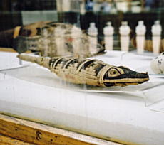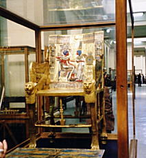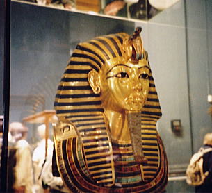 しかし犬やネコはペットとして将来生き返って欲しいのはわかるが、ワニはいったいなんのためにミイラにしているのだろうか。ワニ本人(本ワニ)としては、生き返ってまでまたワニをやりたいとは思わないのではないだろうか? もしオレがワニだったら、ワニとしてはもう死んで構わないので、もうちょっといい生き物(せめて哺乳類)に生まれ変わりたい。いくら復活しても爬虫類では、女の子に近づいてもキャーキャーと逃げられ悲しい思いをするだけだろう。 もちろん動物だけでなく、ここでは人間、しかもファラオのミイラがごろごろと展示されている。なんとラムセス2世のミイラまであるのである。ツタンカーメンと同じく3300年以上前のファラオであるが、ここではガラスケースに入っているだけで、30cmの距離に接近して見ることができるのだ。3300年前の歴史上の大人物である。こんなの信じられるか?? いいや到底信じられないね。 このミイラ展示室に並ぶファラオからしたら、卑弥呼や項羽や劉備やキリストですら1000年以上後に誕生する未来人なのである。もし日本で卑弥呼とか中大兄皇子のミイラが発見されたら、吉岡美穂とIZAMの結婚に並ぶ空前の大ニュースになるはずだ。それが、エジプトでは卑弥呼より1500年以上も前の歴史上の人物、命は無いとはいえ実際にその肉体がここにあるのである。オレはいつまでもラムセス2世の死体から目を離すことができなかった。完全にミイラに魅入られてしまったのである。 ……今わかった? 完全に、ミイラにミイラれてしまった。 ほら! この旅行記は、真面目な話をしているようでも随所にギャグがちりばめられているんだよ。 いやー、しかし彼らも発見されるまで3000年以上棺の中、やっと発掘されて世に出られたと思ったら今度はショーケースの中でかれこれ数十年、トータル3300年以上同じ状態で、いったいどれだけ退屈なことだろうか。たとえ60GBのiPodに詰められるだけ曲を詰めたとしても、3300年ももたせるのは不可能であろう。オレだったら到底耐えられないことである。おそらくオレがミイラとしてショーケースに陳列された暁には3日も経てば我慢も限界に達し、自分を見ている客をガラスを突き破って捕まえ、「おまえが代わりに入れ〜〜〜っ!!」とガラスの中に投げ入れ交代するであろう。 さて、ミイラに付き物なものといえば包帯と透明人間と財宝である。 考古学博物館は2階建てになっているのだが、2階のフロアの半分のスペースを埋めているのが、ルクソールの王家の谷にあったたったひとつのごくごく小さな墓から発見された、時価200兆円とも言われるツタンカーメンの財宝の数々である。 もうこれはとにかく黄金。あれもこれもとにかく金である。カーメンさんの座右の銘は黄金である。