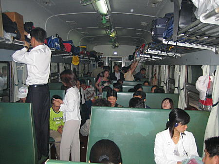 〜無座地獄(ウーツォティーユー)〜 そんなこんな(どんな?)で、待合室で何もすることも無いままなんとか6時間くらいが過ぎた。ようやくあと少しで発車時間である。と思う。多分。 いやあ、長かった……。だいたい、深夜の1:49分発というのが客をナメてんだよ。昼間ならまだしも、そんな真夜中に待合室でひたすら待たされることで、我々善良な一般市民がどれだけ苦しまされるかという、そういうところへの想像力がちょっと乏しいんじゃないかキミたち(キミたち=ダイヤを組む中国人)? もう本当に長かったんだってこの6時間。見知らぬ中国の駅で深夜に一人で6時間だぜ? 退屈な上に、めちゃめちゃ心細いしさ……。 おっと!! それはそうと、何時ぐらいになった? ボケっとしていて乗り過ごしたらシャレにならんぞ。 …………。 おっ。 まだ8時半じゃねーかっっ!!! 前の章の終わりから23分しか過ぎてねえっっ(涙)!!!! ちょっと、どういうことよこれっ!!! オレの頭の中ではとっくに6時間経ってるんだぞっっ!!! だってすんげー長いこと座ってた気がするもん!!! 長い時が経ったような気がするんだもん!!!! これだけ苦心して退屈を乗り越えたのに、なんでまだ23分しか経ってないんだよっっっ(号泣)!!! だいたい常識的に考えて、章が変わってるんだから今回は乗車するシーン、もしくはもっと進んで車内の描写から始まるのが筋だろう。紀行文ってそういうもんじゃねえかよ。この旅行記はだいたい1週間に1回の更新なのに、その1週間でたった30分の出来事しか書けていなかったら、同じペースで1年間の旅を全部書き終えるには350年かかるぞ。記憶も無くなるっつーんだよ。 ただ、今回の部分を前の章から続けて読んでいる人のことを考えると、あっという間に6時間を過ぎさせてしまうのもなんか悔しいんだよな……。オレが「辛かった辛かった」って涙ながらに書いても、読む方はなんの同情もせずにたった数秒でオレの6時間を消費するんだぜ? そこで目を閉じて本当に真剣に「初めての中国で深夜一人で電車を待つ6時間の辛さ」というものに思いを馳せてくれる人なんて誰もいないんだよ。下手したら菓子食いながら読んでるんだぜ人が苦しい思いしてる旅行記を?? ふざけるなよあんたっ!!! 駅の待合室のオレはひもじいけど何も食べずに待ってるんだぞ!! 少しはわかり合おうとしろよっ!!! なんだその不快感の一切ない適温に保たれた部屋はっ!!! 今すぐエアコンを消せっ!!!! こうなったら悔しいので読むのに6時間かかる文章を、オレが記憶を持っている人生のいちばん最初のシーンから最近のマッサージの先生への恋の話まで、淡々と作文にしてべらぼうに長く書いてやろうか。と一瞬本気で思ったが、よく考えたら読むのに6時間かかる文章を書いたらオレは100時間ぐらいを更に無駄にすることになるため、結局もうどうしようもないのだ。もう泣き寝入りするしかない。100時間かけて半生を綴って、それも読み飛ばされようもんなら無駄の上に無駄を重ねることになる。オレの半生そのものまでが無駄だということになってしまう。人生は「半生×2」であるが、半生が0(無駄)であるならば「0×2=0」でオレの人生すべて無駄ということになる(号泣)。 あっ。 そんなこんなで本当に電車の時間だ(号泣)。 いいんだよ。6時間最高に辛くて必死だったけど、それはオレだけが胸の中にしまっておけばいいんだ。どうせ人間は他人の苦しみなんか感じることは出来ないんだから。 待合室の半分以上が同じ火車(ホーチョー)に乗るらしく、中国人+オレの大移動が始まった。う〜んこんなにたくさんの乗客がみんな同じように6時間も待ってたのか……。中国では、昔からこんなことが当たり前だったんだな。これだけ大勢の人がしょっちゅう退屈をもてあましていたら、そりゃあ乱のひとつやふたつ起こしたくなるわ。そうやって義和団の乱とか起こったんだろ? 車両入り口には荷物を抱えた中華人民の皆様が殺到。きっと、みんな無座なのだろう。イスの席だったら全部指定席なんだから、殺到する必要は無いからな。 人と争うことがなにより苦手で、誰かを傷つける位だったら自分が傷つく方がずっとマシという考えの優しすぎるオレは、うごめく塊と化した乗客の最後尾についてやっと車両に入ることができた。というかもちろん中国人の小競り合いが激し過ぎてとても割り込めなかったというのが本当の所である。インド人の中なら突撃して行けないことも無いが、中国人だとなんか怖いのはなぜだろう。やっぱりイメージが……。歌舞伎町……マフィア……青龍刀……。 さて、無座のチケットを持っている者は、最もランクの低い座席である「硬座」がもし空いていたら勝手に座ることが出来る。とはいえ、そんな貴重な空間は先頭で殺到した方々がとっくに殺し合いの末に確保しており、さすがの漢委奴国王(かんのなのわのこくおう)であるオレも特別扱いはされない。 乗車率5万%の血みどろの車内を見渡してみると、中央の通路に人が
