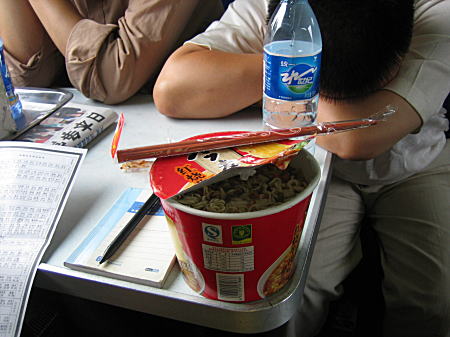 〜成都(チョンドゥー)〜 現在時刻は午前10時。成都到着まであと4時間ほどだ。 徹夜で立ち尽くし疲労困憊していたとはいえ、神経質なオレが硬座で座りながら寝られたのはほんの3時間であった。ましてや、今はオレの荷物の領空を中国人乗客の口から吐かれるおぞましい毒液(汚染物質)が右へ左へ蝶よ花よいくよくるよと飛び交っているのである。おちおち寝られたもんじゃない。 だいたい、全日本プロレス時代の永源遙のたった一人のツバ攻撃ですら観客は傘や新聞紙を持って防御していたのに、それが今は通行人含め無数の中国人のツバ機銃掃射が行われ、それを我がバックパックはヒラリマントも持たずに丸腰の状態で右から左へ受け流し続けているのである。これはセコンドに就いているオレが寝ている場合ではない。持ち主のオレが心をこめて励まし、あわよくばドスで胸に「闘」の文字を刻んで「オレもいつでもおまえと一緒に戦っているんだぞ」という決意を見せてやらなければ(男塾名物・血闘援)、バックパックも気持ちが折れてしまうではないか。 ……なんだ。何か文句あるか。なに? 前回の章の最後では、「目が覚めた時には、もはや夢の成都はオレの眼前20kmに迫っているのであった」と書いてあるって?? もうほとんど到着してたはずなのに何で時間が戻ってるんだって?? だから、夢の成都は目前まで迫っていたけど、目が覚めてみたら現実の成都はまだ全然遠かったんだよっ!!! そう簡単に着いてたまるかっ!!! 章が変わったら一気に時間が進むと思ったら大違いなんだよ!!! オレの旅行記はスポ根マンガの進行を参考にしているから、2時間の出来事を描くのに平気で3ヶ月くらい引っ張れるんだっっ!!! 会話だって1秒間に3往復分ぐらい成立させることが出来るんだぞっっ!!! 「キミは、これから成都へ行くのかね?」 「はいおじさま。その通りです。僕は四川省の省都である成都へ行くのです」 「そうか。キミは学生かね? 成都の学校へ通っているのかい?」 「いえ、そうではありません。成都へ行くからって生徒なわけではありませんよ(笑)。僕は観光旅行に来た日本人なのです」 「なに、日本人だったのか! それにしてはそれなりにいろんな中国語を知っているじゃないか」 「そうなのです。僕はいろいろなことを知っているのです。日本では80年代にこんなコーヒーのCMがありました。『さくら剛は知っている……。(ソプラノで)ダバダ〜ダ〜ダ〜ダバダ〜ダバダ〜♪ ダバダ〜〜ダバダ〜〜ダ〜〜〜〜〜〜♪』」 「さすが違いのわかる男」 ※ここまでの会話、経過時間1.17秒 ……ダバダ〜♪の部分はもちろんおなじみのねつ造会話であるが、それでも他の部分それなりに隣のオジサンと話が噛み合っているのは、だいたい中国人との会話がパターン化して来たからである。 オレが老若男女様々な現地の方々に話しかけられる際、大抵聞かれるのが、「おまえは学生か?」である。「学生」の発音は「シュエション」なので、出会いしなに相手の口から発せられた文章の中に「シュエション」という言葉が含まれていたら、必ずそれは「おまえは学生か?」と聞かれているのである。オレは「学生が休み時間にシュエション(連れション)に行く」、という語呂を考えて見事にこの単語をマスターしたのだ。 そもそも、文字で表した場合「学生」は中国でもそのまま「学生」だ。右から左に流れるニョロニョロした文字が落書きにしか見えなかった遠い国から旅をして来たオレからすれば、これはもの凄いことである。つまりは世界で唯一日本と同じ文字を使う国が中国であり、唯一中国と同じ文字を使う国が日本であるのだ。そんな家族みたいな国同士なんだから、もっと仲良くすればいいのになあ。納得いかないことがあったら、まずは話し合おうよ。オレたちは家族じゃん。いきなり家族の食べる餃子に毒を盛るとか、やめてくれよなっ。伊達政宗の母親じゃあるまいし。 ちなみに隣のこのおじさまは筆談で職業を聞いてみると「司机」、辞書で調べたら「運転手」ということだが、物腰柔らかで教養のある口調が物語るように、いっさい唾を吐かないお人だ。要するに所かまわずペッペッとやるのは別に中国の常識という訳ではなく、中国人の中でもマナーや道徳をわきまえている人はそんなことはしないのだ。 ただ、悲しいことにそのマナーの良い人の割合はもの凄く少ない。「プロ野球珍プレー好プレー集」の番組の中での、「好プレー」が放送される時間くらい少ない。結局中国人も珍プレー好プレー集の番組構成と同じで、ほとんどは珍プレーな人間ばかりなのである。 それではとりあえず、メシを食おう。もう昼前のいい時間だ。 中国で移動の時に食べるものといえば、何をおいてもカップラーメンである。中国のカップラーメン、これも稀に運が悪いと劇薬が入っていて食べた人間がバタバタ死んだりするが(なんでだよ)、そこに当たらなければ非常に重宝な代物である。そのあたりは悩んでいてもキ