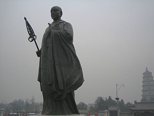 〜西安のバカの墓〜 楊貴妃の墓から日を改め、今日も複雑なルートを辿り次なる有名人の墓がある寺院へ来た。西安に着いてから、毎日連続でそこらの墓を訪問しまくっている私。今時ここまで活発に墓の近辺を飛び回っているのは、オレか人魂くらいだろう。もしかして、自分で気付いていないだけでオレも実は人魂なのだろうか?? 本当は、ベトナムで肺炎になったあたりでオレ、死んでたりして……。でも自分では死んだことに気付かず、中国に行きたいという怨念でさまよえる魂が旅を続けて旅行記も書いてたりして。そうだとしたら、誰か、死んでいるんだということを僕にわからせて下さい(涙)。でないといつまでたっても旅が終わりません。そして、旅立てません(号泣)。 それにしてもやっかいなことは、ここ数日は墓ばっか訪れているのだが、どれも市の中心から離れたとんでもない場所にあるため、頑張っても1日2カ所しか回れないということだ。墓ばっかなのに、全然はかばっかしくない(はかばかしくない)。…………。おあ〜〜〜〜っはっは!! さあて昼メシにするか!! 寺の前の道で売られているコンニャクねぎご飯みたいなのを食うとしようぜ! そして食った。小さなどんぶりに入れられたコンニャクねぎご飯みたいなのを。 「ごちそうさま。全然美味しくなかったけど、いくら?」 「10元」 「ふざけんなてめーーーーーーーっっっ!!!! オレが何ヶ月中国を旅してると思ってんだよコラッッ!!!!! こんなもんが10元のわけねえだろっっ!!!!」 「じゃあ5元」 「なめんなゴラーーーーーーーーッッ!!!! 5元でも高すぎるわっ!!! 田舎の道端で売ってるどんぶりメシが2元を超えることが無いのはこちとら体でわかってるんだよっっ!!! これでも取っときやがれっっっ!!!!! バシィン!」 「けっ」 強欲夫人の目の前に1元紙幣を2枚だけ叩きつけてみると、夫人は一度悪態をついたがしかし食い下がる気配は無い。ということはつまり、正規価格は2元、もしくは1.5元程度だということだ。マジでイライラする……。わざわざ現地の交通機関を使って中国の隅々まで観光しようとこんな遠くまで一人で訪れている外国人を、どうして騙そうなんて思えるんだ? しかもただの外国人じゃない。押尾学似だ。押尾学似の外国人だ。基本的に女性がほっとかない立場なんだぜ?? 食後にこんな不愉快なゴタゴタがあると、今食べた物まで元々全然美味くなかったがそれにも増してもっと不味く感じられてくる。こんな思いやりのないコンニャクねぎご飯みたいなの、モンドセレクションに参加したら最低金賞確実なんだよテメエッ!!! この強欲夫人がもし国会議員になったら、政治団体を隠れ蓑に(よく聞くけど意味がわからない表現)不正な企業献金を受け取りまくるぜ絶対。あらゆる不正に手を染めそうだぜ。おまえなんか、不正脈になりやがれっ。ていうかこういう悪人には緊箍経(きんこきょう)を被せて、三蔵法師のお経で頭がひょうたん形になるまで締め付けてほしい。まあこれだけ強欲な夫人だと、たとえ頭がひょうたん形になっても気にせず旅行者を騙し続けそうだけど。むしろ観光客が来たら自分のひょうたん形の頭の記念撮影料金を徴収して荒稼ぎしそうだ。 というわけで今回やって来たこの「興教寺」にあるのは、唐の時代の僧侶・玄奘の墓である。ご存知の方も多いだろうが、玄奘というのは、いち……にい……さぁぁん蔵(バカになって)!!! さぁぁん蔵いち、さぁぁん蔵に、さぁぁん蔵さん、さぁぁん蔵し、さぁぁん蔵ご、さぁぁん蔵ろく…………(中略)、よんじゅう(いつものイケメンに戻って)。……このギャグも、今ではもう墓に入っているのだろうか。 つまり僧侶・玄奘とは、西遊記でおなじみの坊さん、「悟空、おやめなさい」でおなじみの三蔵法師のことなのである。西暦600年ごろ、今から約1400年前、ここ長安に三蔵法師は実在したのだ。 この塔の中に、玄奘三蔵の遺骨が保管されているらしい。 ![]() 劉邦、楊貴妃と違い三蔵は皇帝でも美人でもないが、知名度だけなら今回の墓巡りの中でナンバーワンなだけに、かなり感慨深いものがある。いや待ちたまえ。知名度だけではなく、もしかしたら三蔵だって美人かもしれないぞ。だって、今までドラマで三蔵法師を演じたのは夏目雅子に宮沢りえに深津絵里だぞ? 最高の美人ばかりではないか。映画やドラマで登場する実在の人物というのは、例えばヒトラーや東条英機なんかは、必ず本人とよく似た役者さんが演じているではないか。ということは、実際の三蔵法師だってある程度は宮沢りえに似ていたに決まってる。つまり知名度だけでなく、美人度も楊貴妃と同程度かそれ以上だといえるのではないか。 いや待てよ。そういえば、ドリフターズの「飛べ!孫悟空」での三蔵法師役は、いかりや長介だったな……。まあこの際、それは忘れることにしよう。玄奘の名誉のためにも。だいたいオレ、「飛べ!孫悟空」のことなんて全く知らないしな。主題歌とかも全然どうい