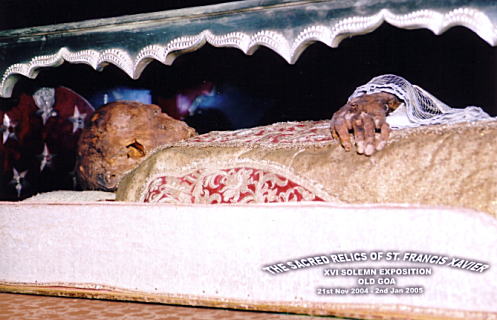 ![]() 〜ゴア2〜 さて、本日は朝から観光である。勇気を出して、バスに乗り少し遠出をするのだ。オレだってもう一人でバスに乗れるんだいと、みんなにアピールしたいのだ。 「ハロージャパニーズ! カムヒアー! バイサムシング!(おい日本人! こっち来い! なんか買え!)」 宿から出た途端、道端にゴザを広げてアクセサリーを売っている12,3歳の女の子から、生意気な口調でお誘いがかかった。まったくよお、初対面の年上に対してなんだよその命令形は。そういう礼をわきまえない態度を取ると、セクハラするぞ! パンツの色聞いてやるぞおまえっ!! 「ヘイ! カムカム! カムヒアー!! グッドなネックレスがたくさんあるわよ!! ヘイヘイ! ウェイト!!」 「うるさいなあっ!! レイターレイター(あとでな)!!」 「レイターじゃなくて、今買ってよ!! ノットレイター!! now!!」 「くそー、日本人をよくわかってる憎たらしい奴め……。あとでって言ったらあとでなんだよっ!! レイター! レイターレイター!!」 「レイターっていつよ! レイターって言ったら本当にレイターなんだからねっ!!」 「(無視)」 余計な気苦労は時間と気力がもったいないので、もっともなことを言うガキは徹底無視してバスに乗りオールドゴアに向かうことにした。 ビーチから約1時間ほどで着いたその古い「オールドゴア」には、「ボムジェズ教会」という16世紀に建てられた由緒ある教会が建っている。そしてその教会の中には、とある歴史の教科書に出てくる重要人物の遺体が安置されているのである。ターヘルアナ富子じゃないよ。 その人物とは、日本にゆかりが深く、日本でも中学、高校の歴史の教科書に必ず登場しているあの有名外国人だ。今でこそ、数多くの外国人タレントが来日し日本の芸能界で活躍しているが、ヨーロッパの人間が南蛮人などと呼ばれて差別されていた1549年当時は、たとえ「奇特な髪型の外国人」という目新しいキャラクターであってもなかなかバラエティ番組などには出演させてもらえず、せいぜいNHK教育の語学シリーズの番組内ミニドラマくらいにしか出ることは出来なかっただろうと思われる。 ![]() 教会に入ると正面に祭壇があり、その祭壇の右側の壁に、このような豪華な棺の中にミイラ化して彼は保存されているのだ。一番右の窓の内側に頭部を見せて横たわっているのがわかるだろう。こんにちエジプト人のフィフィやモデルのSHEILAなど外国人タレントが活躍できているのは彼のおかげであるという、来日した有名外国人の元祖、彼こそが本物のフランシスコ・ザビエルである。