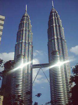 決してくまの〇ーさん、キテ〇ちゃん、〇レヨンしんちゃん、ミッキー〇ウスではありません。 見事な商魂。 一応全動物の寝姿を見て、動物園を後にする。次に目指すのはペトロナス・ツインタワーである。ツインタワーはクアラルンプールの中心地にそびており、中には多くの企業やショッピングセンターが入っているクアラルンプール一の観光地である。動物園からツインタワーへの直通バスは無いため、タワーが程よく見えてきたところで降り、そこから歩く。大体経験からしてあの大きさで見えていれば10分やそこら歩けば着くだろう。 そして歩くこと1時間。またもミイラ寸前になりながらやっとのことで到着。 ツインタワーの高さを新宿伊勢丹くらいだろうと予測し、見た感じで距離を測っていた私はアホでした。事前にこれが世界一高いビルだということを知っていればこんなミイラになることはなかったでしょう。 ちなみにツインタワーの中の日本人の多さにはたまげた。やっぱり発展しているところにはたくさんいるようだ。彼らを見て、そういえば日本人って金持ちだったんだということに気付く。しかし、タクシーや専用バスに乗って帰って行く彼らを尻目に宿までまた1時間かけて歩いて帰る自分に、「オレって本当に日本人なんだろうか?」と問い掛ける今日この頃であった。 もうかく汗はない。 ![]() 世界一高かったビル、ペトロナスツインタワー。 |