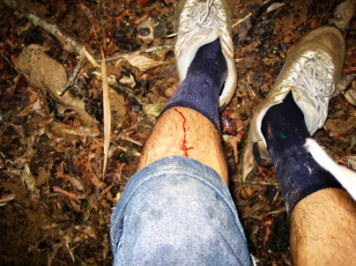 ![]() 〜楽しい密林7〜 ↓ひたすらジャングルを歩く私。これはまだ動画を撮る余裕があるくらい通り道がはっきりしている部分。そして1時間後、道を見失う。 ……ひとりで黙々と密林を行く。面白いことなど、何もない。やはりオレには海外旅行の楽しさが全然わからん。こんなことが海外旅行だというならば、旅行好きな奴等は全員変態か修行僧のどっちかだっっ!!!! 海外旅行がストレス解消になるなどと、一体どうやったら言えるんだてめえっっ!!! 森の中で何度もヒルに血を吸われて、昨日なんてあまりの恐怖で30分しか寝れなかったんだぞ!!!! どんなストレスがこれで解消されるんだよっっ!!! ぜぇ……ぜぇ…… そんなことはいい。楽しくても楽しくなくてもいい。いいから早く……早く村に着かせてくれ……。 汗と蚊と薮にまみれて道なき道を前進し、再び20分が過ぎ、30分が過ぎた。誰もいないし、何もない。聞こえるのはただ無数の鳥と虫の鳴き声のみ。 見えない。どんなに遠方に視線を飛ばしてもジャングル以外見えない。一体、いつになったら着くんだ。 ここまで30分間、歩いて来たのは1本道のはずである。注意して見て来たが脇道分かれ道には気付かなかった。だからこの道で正しいと思う、しかし……。 どうもおかしい。今までのルートで越えて来た小川にはどこも橋代わりの丸太が掛けられていたのに、目の前の川、いやむしろ沼??には渡る部分がない。とはいえなにしろ1本道だし……これを越えなきゃどうしようもないぞ……。 幅はほんの3メートルほどだ。しかし、ジャングルで沼といったら、底が無くてなんぼである。ちゃんと空気を読む沼だったら、場所のイメージ通り底なし沼になっているはず。ここでオレが沼にはまってしまったら、当然誰にも発見されず永遠の行方不明者である。もし何かのきっかけで数年後に引き上げられたら、その時には泥パックの効果で若返り10代の頃のハリのある肌を取り戻しているかもしれないが、美肌といえど死体では男女交際もままならないじゃないのようっふん。 見た目はだいぶ浅い川であったが、念には念を入れて一歩を着地する前に必ず杖代わりの木の枝を力いっぱい地面に刺し、強度を確かめて歩く。しかし途中まで順調に進みすぎたからだろうか……、最後の一歩を不用意に踏みしめた時。 ズブズブズブズブズブズブズブズブ…… うおおおおお〜〜〜〜っっっっっっっ!!!!!! なんてウッソ〜〜〜〜ん。 びっくりした? ちょっとイタズラしてみたかったの。まあ、誰も見てなかったけど。でも近くの木に止まってた鳥と虫はちょっとビビってたよね。一瞬鳴き声止んだもん。ザマーみろコラッ!! 木ごと燃やしてやろうかこの下等生物がっっ(完全な八つ当たり)!!!! 川を渡ってまたしばらく。またまたより以上に道なき道、オレが勝手に通路だと認定している部分はほんの数10cmの狭さになり、なおかつ何メートルかおきに植物に埋もれて途切れているが、しかし信じるしかない。きっとこのルートであっているんだ! 道のない丘につき当たったため、謎の虫が這う木の根や枝を軍手でつかんで必死で登る。登ったところで、今度はそのまま下りだ。他のジャングルはどうだか知らないが、とにかくここは起伏が激しい。ただでさえ暑くて暗くて不気味な所なのに、これだけ上り下りがあると疲労も倍増である。 これが村の手前の最後の障害だと自分に言い聞かせて、急斜面をほとんど飛び降りるようにオレは丘を下った。そしてまた平地に復帰し、10メートルほど歩いた。するとその地点で、今まで道だと思っていた僅かの空間が、完全に消滅した。 …………。 いや、そんなわけないじゃん。右を向けば道があるんじゃんきっと? …………。ない。 それじゃ、左を向いたらあるんじゃん? …………。ない。 もう一度右を向けばあるんじゃん? …………。ない。 じゃあ、たまたまちょっと途切れているだけで、無理矢理先に進めばまた人間が通れる広さの道が現れるのですよ違いありませんよきっと……。 自分がジャングルの中で道でない場所を歩いているというような恐ろしい結果を到底受け入れるわけにいかなかったオレは、しばらく行けばすぐに通路が復活するに違いないという信念のもとに、枝を払い藪を踏みつけて汗だくで前進した。 …………。 無い。どう見てもこの先に道は無い。 いかん。 これは…………。迷っている。完全に経路を見失っている。 たしかに、もう結構前の段階でおかしかった。旅行者が通る通路にしてはさっきの上り下りは木にしがみつかなければ動けないほど急すぎたし、橋のかかっていない川もそうだし、とっくのそれ以前から道がはっきりしなくなっていた。つまり……、オレは決して今の段階で道を見失ったわけではない。もう、ずっと迷っていたのだ。そうとは知らず、どんどんルートから外れた密林の中に入り込んでいたのである。 いや〜〜。まったく。 …………。 …………。 ぞわわわ〜〜(背筋が激しく凍る感じ) 
