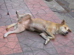 ![]() 〜オチンコファイトクラブ〜 ↓ヘンな体勢でだらける野郎ども(カオサンストリート) ![]() 死体博物館で山ほどの死体を見た影響で、オレはその日からしばらく快適な宿のベッドで惨殺死体レベルの動きの無さでひたすらマンガを読み、ほんの時々起きて日本食や屋台メシを食いまくってはまたベッドに戻り死体になり、食う時以外は起き上がらないという人として理想的な生活を送っていた。 なにしろ10人部屋のこのドミトリー、昼間からほとんどの旅行者が同じように死体化してマンガとともに横たわっているため、怠けているという罪悪感も全くないのである。まあ当たり前だ。元々怠けることに罪の意識を感じるような人間だったら、今の時点で日本で会社勤めをしているはずである。今さら「よし、ベッドでゴロゴロなんて怠けてないで、ちゃんと長期旅行者らしく移動をしよう!」などと改心し実際にいろんな街をフラフラと渡り歩いたとしても、それもものすごく怠けている。どっちにしろ怠け者だと思われるなら、より心身に負担のない怠け方のほうがよいではないか。 ともあれ、死体博物館では研究室にたくさんの死体が裸で横たわっていたが、宿の部屋に帰って来てもなんだかあまり死体博物館と変わらない光景だ。博物館から一体持ってきて宿のベッドに乗せ、逆に旅行者を一人そのまま博物館に持っていってホルマリンの中に浮かべても、誰も交換されていることに気づく奴はいないと思われる。しかし、光景ではいい勝負でも、医学ひいては人類への貢献度はこの宿は死体博物館に完敗である(号泣)。 だいたいここに宿泊している30人ほどの日本人長期旅行者(もちろんオレ含め)は、全員無職だ。むしろ建物に放火して焼死体を陳列し、第2の死体博物館として保全した方が世の中のためになりそうである。この宿で働いているタイ人の女の子達は、彼女らの世話になりながら毎日働きもしないで食っちゃ寝食っちゃ寝してるオレたちのことをどう思っているのだろう? きっと帰り道には、同僚と「本当にこの世界って不公平よね。あんな『絶対に結婚したくない男ランキング』殿堂入りの男ども、全員強盗にでも刺されればいいのに」などと悪口で盛り上がっているに違いない。 まあそんな感じで死体より役に立たない人間としての暮らしをしばらく続けていたら、再びそんじょそこらの水死体には負けないくらいの異様な腹の膨らみ具合になってきた。ジャングルで凹みきり、一時は蚊すらも止まりどころが見つからないほどの絹糸より細い腹になっていたが、それも今は昔、現在はシンガポールの七福神時代をも超えた見苦しい出っ腹だ。 こんな腹では、もし誰かを追っているヤクザがやって来て「おい、今ここに若い男が逃げてこなかったか?」と聞かれ、素直に「いや、知りませんね」と答えても、「ウソつけ! じゃあこの腹は何だ!! ここにかくまっているんだろう!!! ちょっと事務所まで来いやあ!!!」と恐ろしい濡れ衣を着せられそうである。 さすがにオレは焦った。 いくら旅行中とはいえ、「ちょいワル引きこもり」としてダンディーさで注目を浴びていたオレが、こんなブヨブヨな姿でいいわけがない。今年からメタボ検診が始まったが、こんなことではメタボ検診の検査室に入る時点で入り口に腹がつかえて通れないと思われる。 どうしよう。何とかしなければ。耳なし芳一が住んでいる寺に行って、わざと腹に経文を書くのを忘れて平家の怨霊に腹を持って行ってもらおうか。耳なし芳一の続編として、腹なし芳一という怪談も出来るだろうし、日本文学界のためにもいいかもしれない。そういえばタイは仏教国なので、カオサンの近辺にも僧侶がたくさん歩いている。彼らに頼んでお寺まで連れて行ってもらおうじゃないか。 ということで、ある日重い腹を抱きかかえながらオレは芳一の住む阿弥陀寺を探して右往左往していたのだが、なかなか目当ての寺は見つからず、結局果物屋台でスイカやパパイヤを買って裏通りを食べ歩いていたら、なんかムエタイ(タイ式キックボクシング)のジムの前にさしかかった。 そのジムはこちら側の壁が無く、通りからは完全に中が見えている。テレビで良く見るボクシングジムと同じく、リングがどかっとあり、その周りに大きな鏡やサンドバックが並んで裸のたくましい面々が「アイッ! アイッ!」と激しく攻防を繰り広げていた。オレはご存知の通りオタクにありがちな格闘技ファンのため、立ち止まりしばらく見ていると…… 「オイ、なんだその若者にあるまじきだらしなくたるんだ腹は!!」 「なんですかっ! 初対面なのに人の腹にケチをつけるなんて! 失礼じゃないですかアナタ!」 「おまえ腹が膨れすぎてTシャツがめくれ上がってブラジャーのようになっているじゃないか」 「さすがにそれは大袈裟に言い過ぎでしょう」 「少しは運動しようと思わないのか?」 「運動しようと思っています。でも今は腹がみっともなくて人前に出られないので